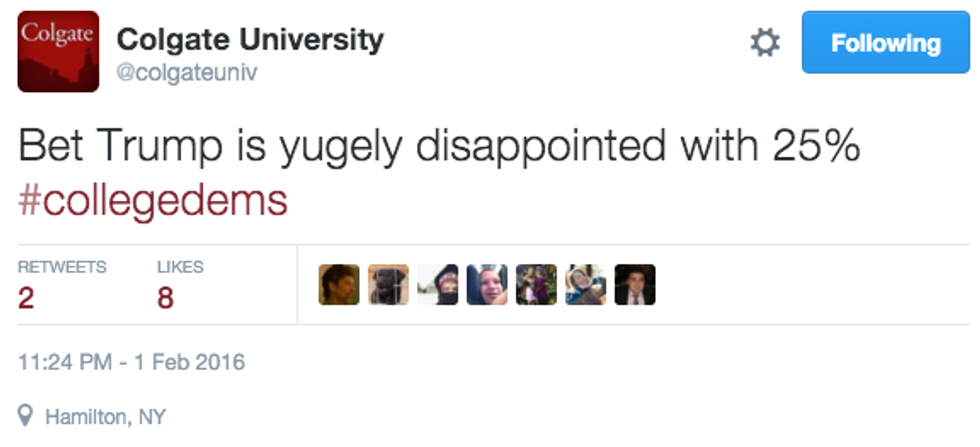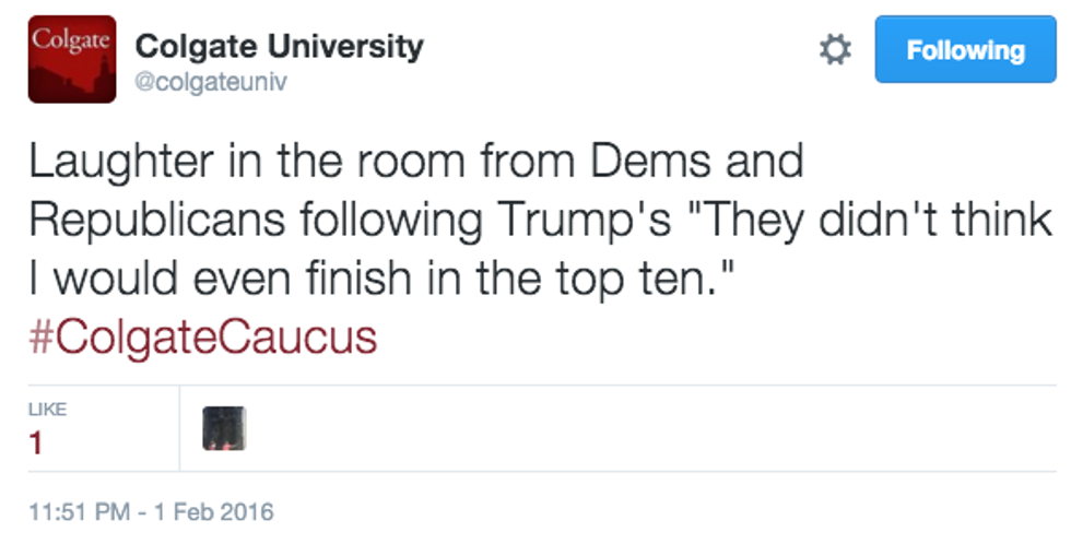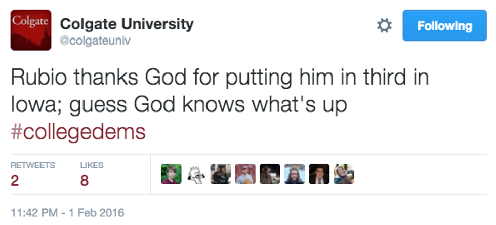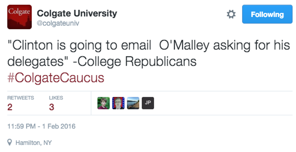 This past Monday the Iowa Caucus was held and I had the privilege to attend a viewing party hosted by the College Democrats and the College Republicans. The Colgate University twitter account handed over the handle to these two student groups to let them live-tweet the #ColgateCaucus event, and I was invited to act as the resident expert on all things Twitter.