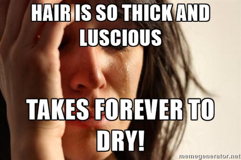 If I decide to wash my hair when I wake up in the morning and throw it in a ponytail (which is awful for your hair, I know), it'll still be slightly damp when I take it out to go to bed. There's too much of it and not enough time to naturally dry. I've just accepted that my hair will be partially wet at all times, so I'm not even going to try and change it.