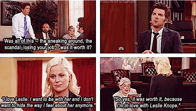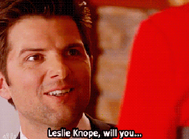 Leslie and Ben had a rocky start to their relationship but when they finally said "I love you" to each other it was magic. It just shows you that they know everything about each other. And in true Leslie Knope fashion she pauses Ben so she can remember every detail and then says yes before he can even ask her.
