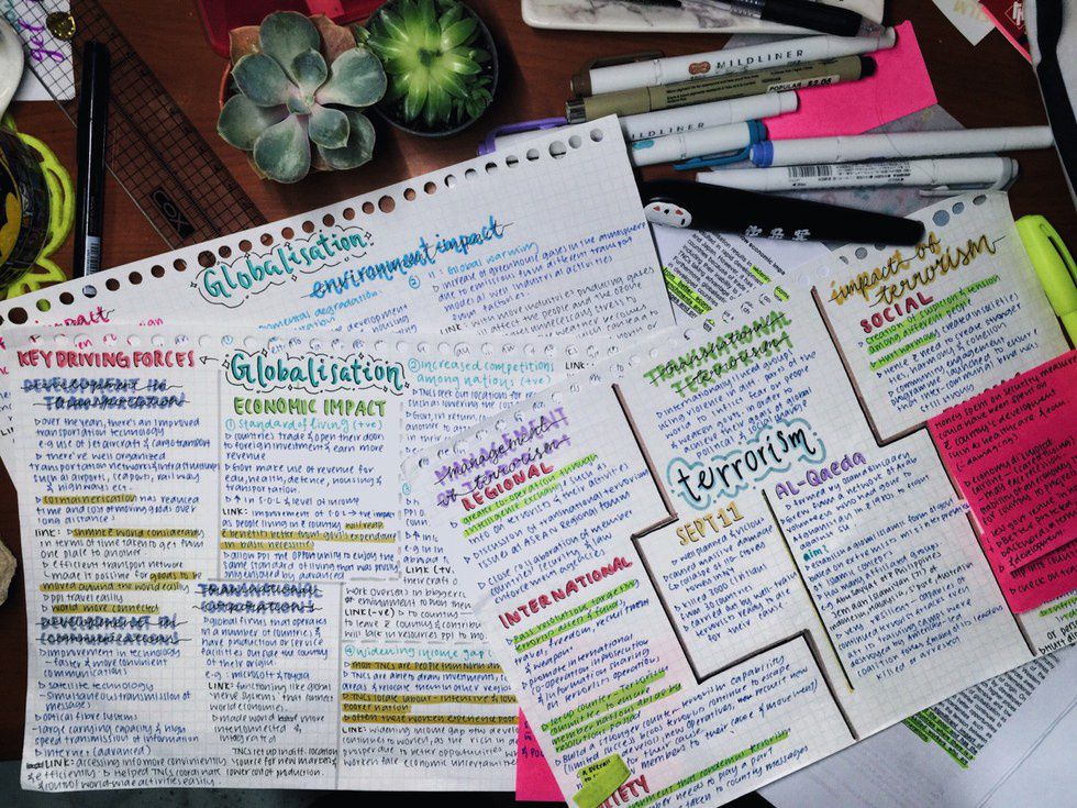 Where are all my artistic ladies at?! Whenever I study for an exam, I always rewrite my notes in an orderly way with many different colored pens and highlighters. The different colors stimulate my thinking and help me focus more than I normally would when reading over boring, black and white printed off notes.