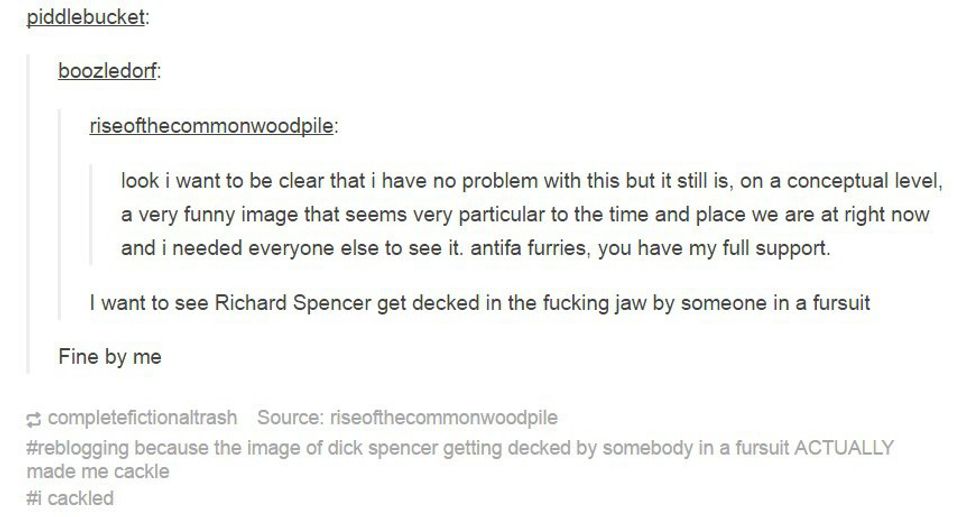 2. This science pun3. This truly gripping bit of prose4. This post that blessed us with the mental image of White Supremacist and liberal punching bag Richard Spencer getting decked by a furry