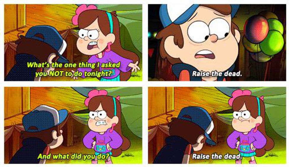 What happens when you mix accidentally-summoned zombies with a karaoke party? Only one of the best episodes ever. In "Scary-Oke", Dipper tries to convince government agents that the journal of paranormal conspiracies he found is telling the truth. To prove his point, he reads a spell that summons a horde of zombies, which he can't control. They wreak havoc on the Mystery Shack's Grand Re-Opening After-Party, and the twins, along with their Great Uncle Stan, have to figure out how to stop them.