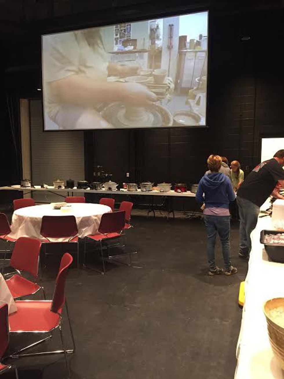 David Macbeth is the mastermind behind this event. Macbeth also spun some bowls outside as people were coming into the building. Inside, there was a film being displayed which was of Macbeth spinning bowls and even some facts about soup! Pottery/Ceramics students make bowls during the semester to be used for this event. The event took place on November 19, 2016 from 11 a.m. to 2 p.m. Many people came through and donated money for the cause.