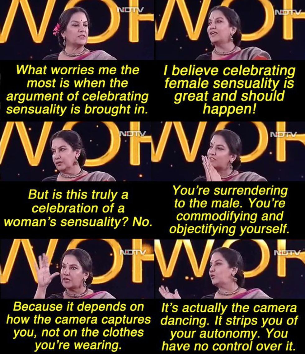 Now don't get me wrong, I'm all for owning your body and sexuality. It's a great form of empowerment. However, to paraphrase Shabana Azmi, when a camera comes into play you lose that ownership and the power rests in the hands of the person holding the camera as to how you will be portrayed. Objectification, hello? Click here to watch this excerpt from the show.