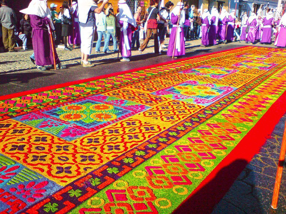 For Easter, different communities in Guatemala create ornate and detailed carpets of sawdust and flowers for their celebration of Easter. The colorful carpets often take weeks to prepare. On the morning of Easter Sunday, processions of churchgoers walk over the carpets as they head to Easter mass is their local church.