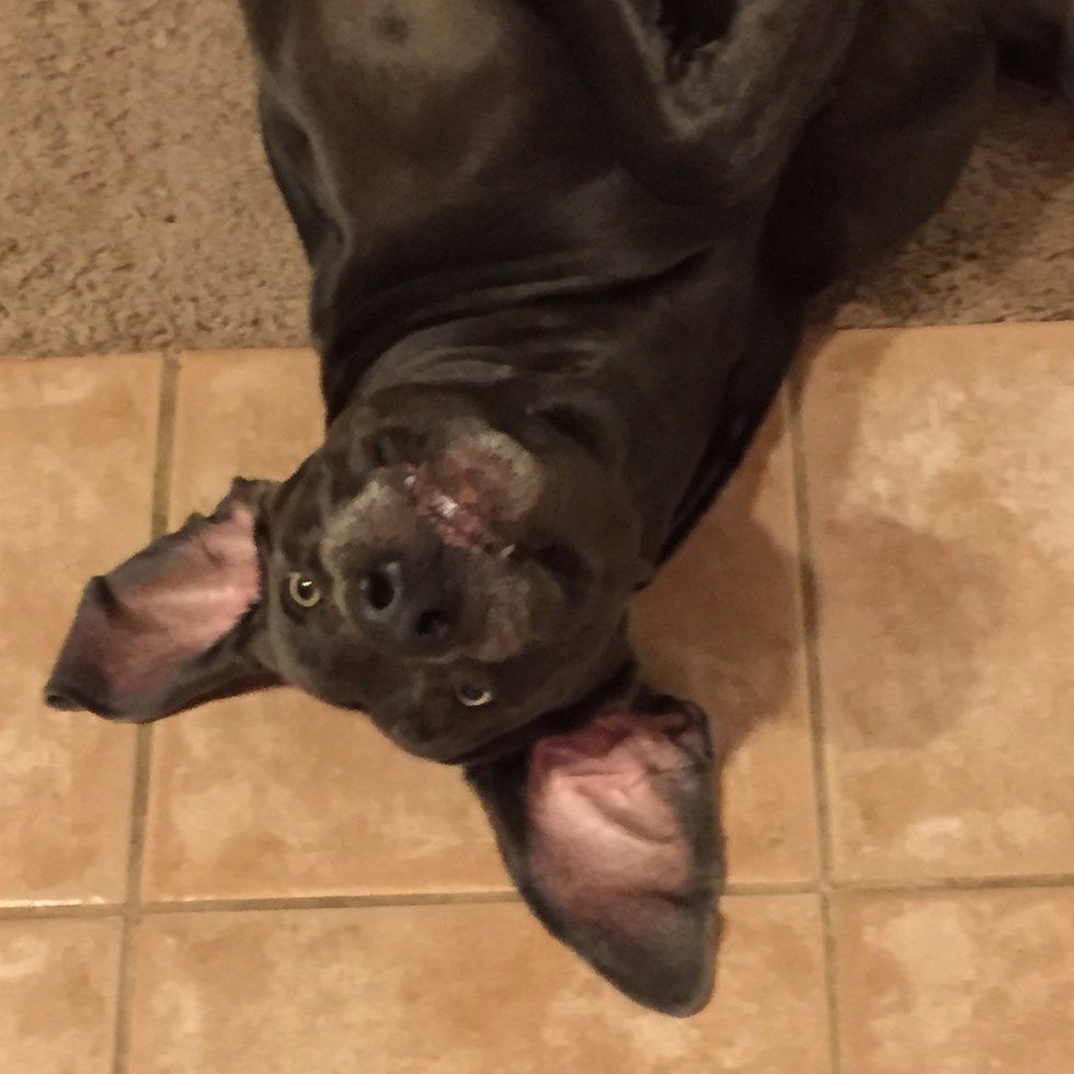 Tucker here enjoys laying upside down, which makes him look like a gremlin, but at least he's happy.