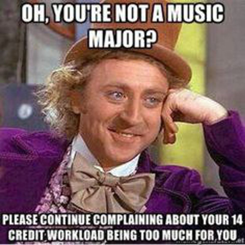 Being a music major is difficult. True, we aren't curing cancer or discussing quantum theories in our lessons. Sure, we count ensemble rehearsals as classes and perform for credit. But with all performances, lessons, and rehearsals comes complete dedication and definite sleep deprivation. We aren't just jamming with friends all day long (although we do really enjoy those times), we are studying, practicing, and honing an art form that we have dedicated our entire lives to. There is no "off switch" that we hit at the end of every day or weekend. We live for our craft and we'd just as easily sacrifice every luxury (such as sleep) for it. There's no simpler explanation than that.