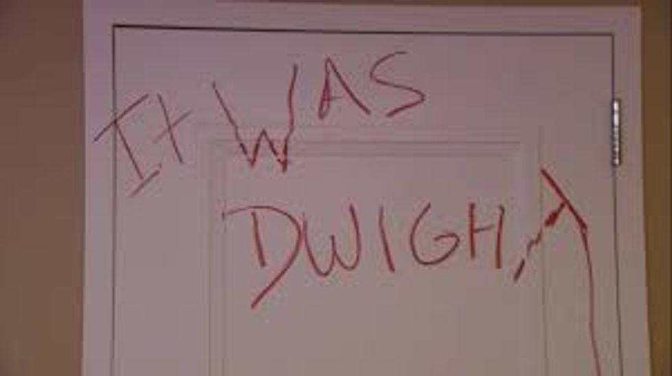 When Jim is invited to Florida by Robert California, he can not get out of his up-at-5 am routine from home. In keeping with regular Scranton shenanigans he decides to pull a creatively perfect prank on Dwight: Jim got into some trouble, and someone has blamed his absence on Dwight in eerie wall-writing. Cue Jim’s lifeless body falling out of the closet, landing among the blood and cash strewn about.
