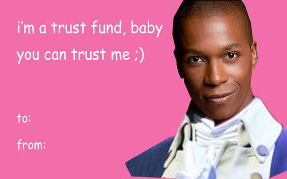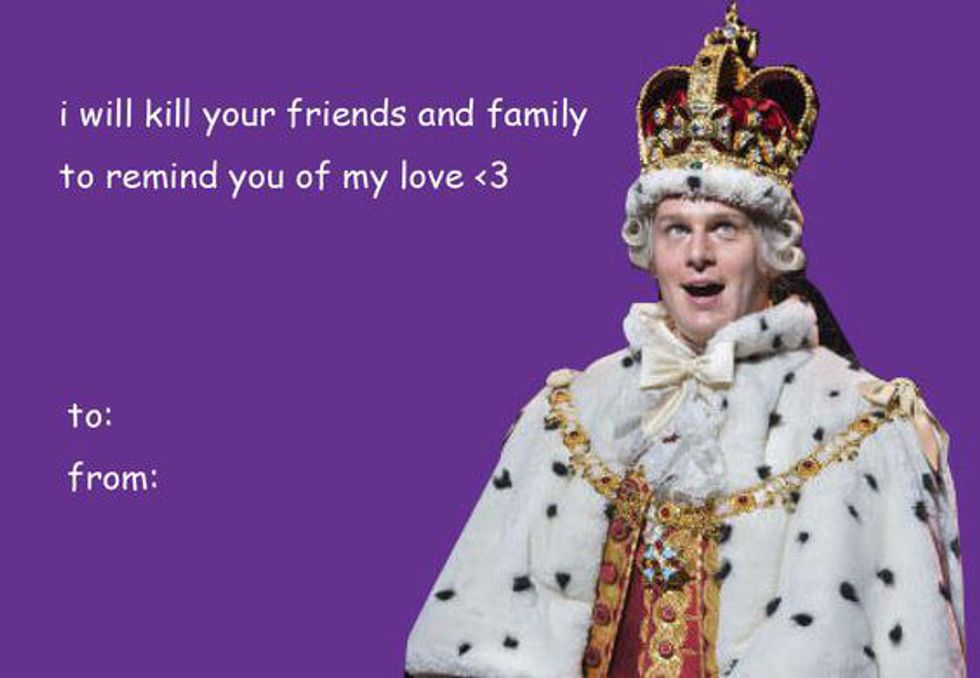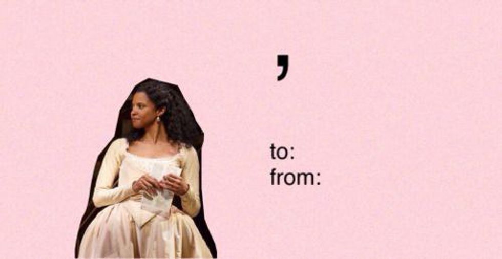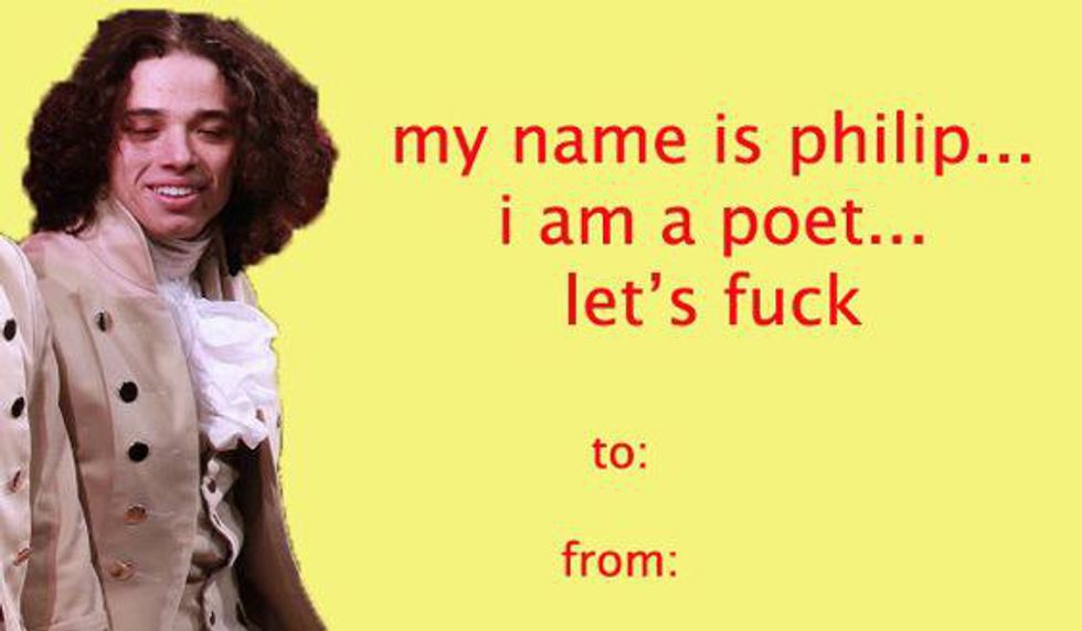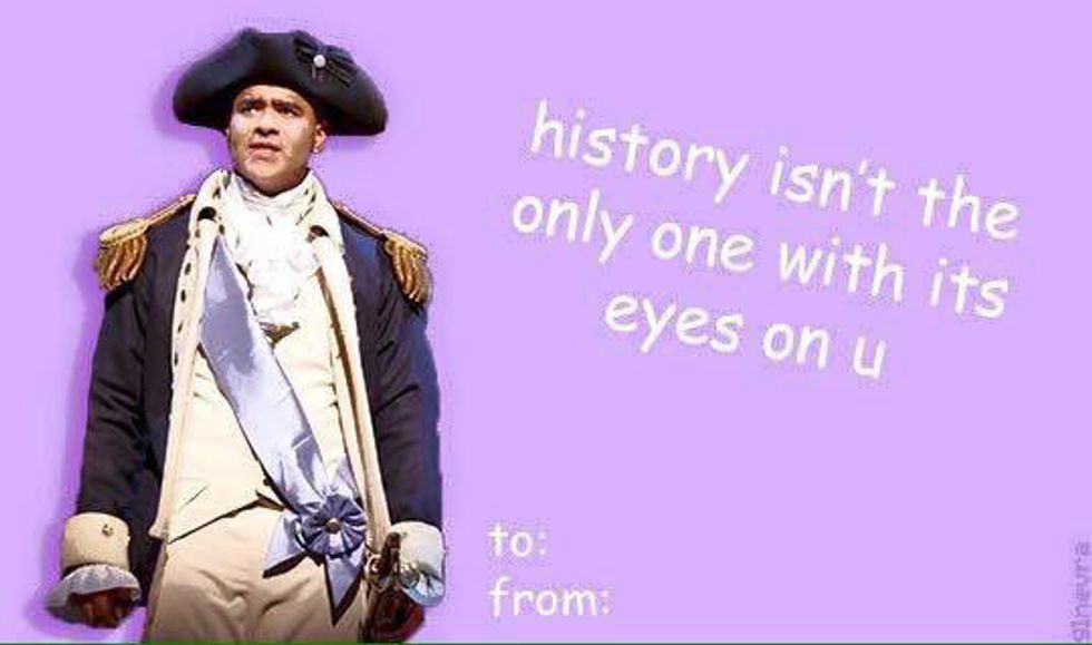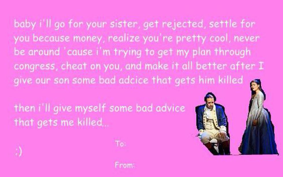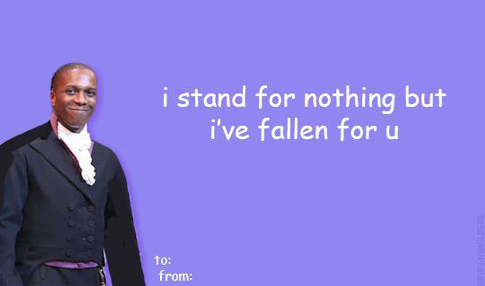 Happy Valentine's Day! Nothing says "I love you" more than a reference to "Hamilton: An American Musical." Having Alexander Hamilton, John Laurens, or Aaron Burr telling your significant other is true love. There are great puns and quotes from Hamilton that are just perfect for Valentine's Day; here are some cards that you can send that someone special: