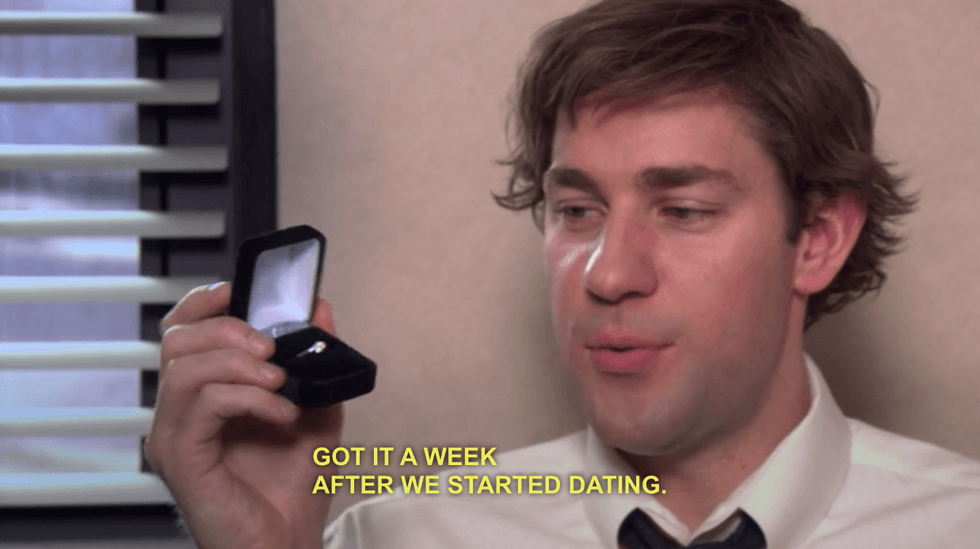4. Okay, the reason why this one made this list is because Jim is amazingly sweet and he bought Pam's engagement ring a week after they started dating and it's not even the slightest bit creepy.