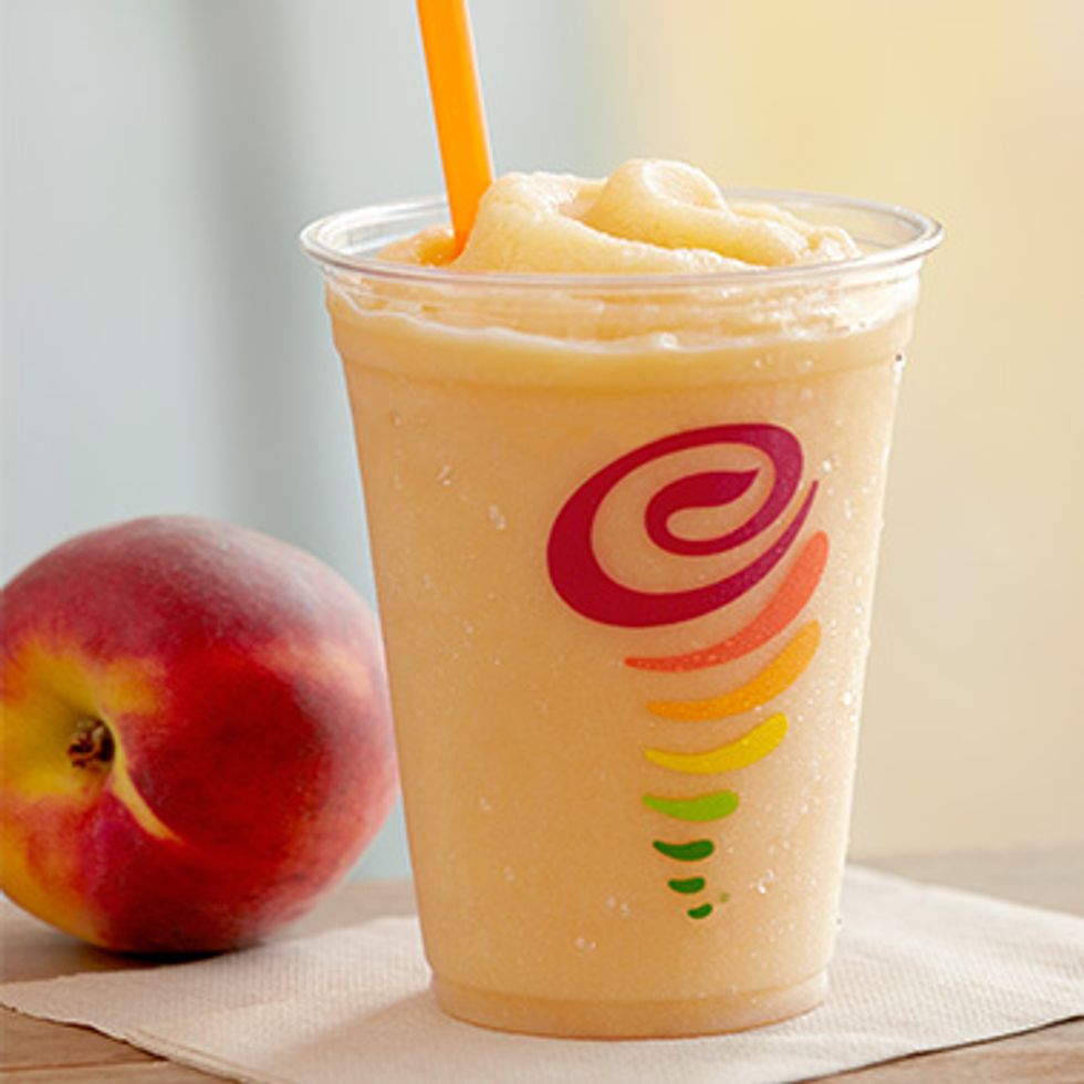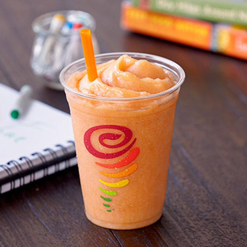 This is a smoothie that not many people order. I have worked at the Jamba Juice on campus for over a year and I have only made this smoothie about four times; however, this smoothie is one of my favorites. It is composed of peach juice, orange sherbet, peaches, and banana. I like to substitute mangoes in for the bananas so if you would like to try it then go for it!