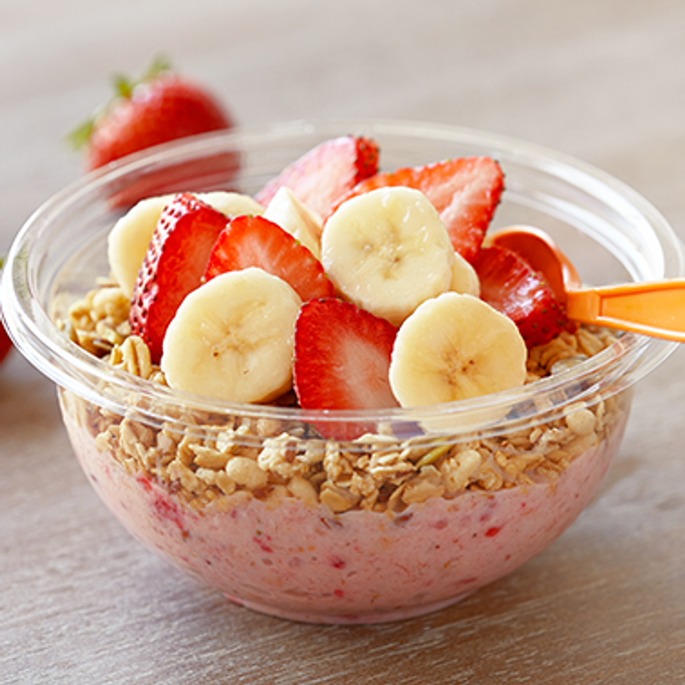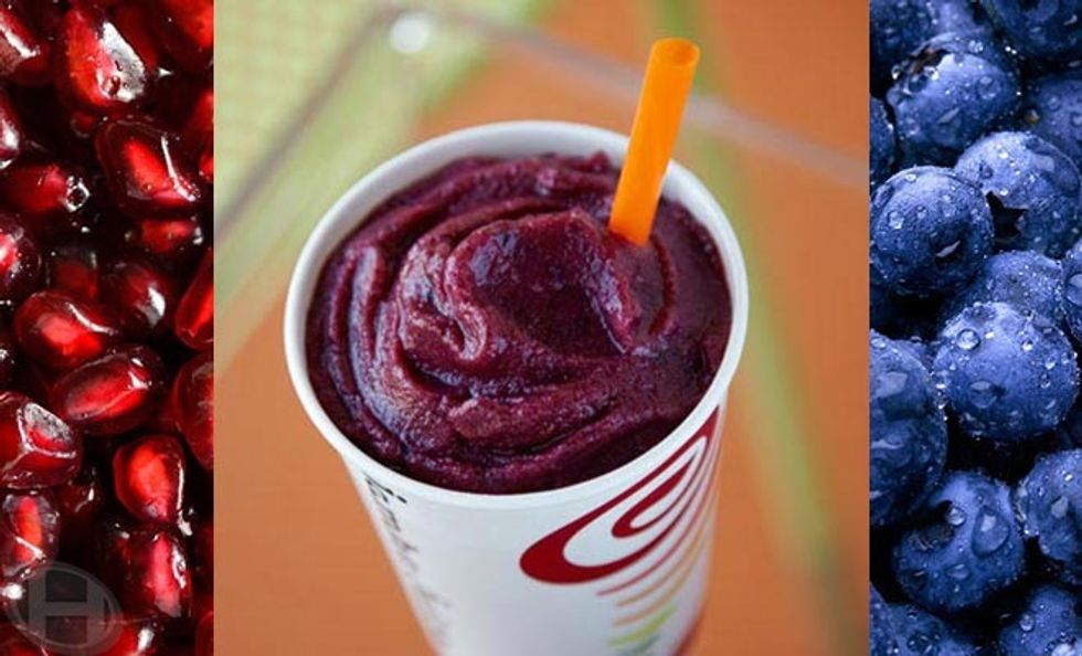 The Açaí Super Antioxidant is slightly different from the bowl. It is composed of Açaí berries, soymilk, a shot of daily vitamin, raspberry sherbet, strawberries, and blueberries. If you don't want the toppings of the bowl then this is the smoothie for you. If you want, you can even add the bananas to it or just keep it how it is!