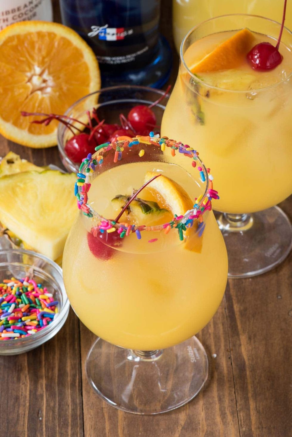 I will request this song as I sip this by the bar. You will need 2 oz. of cake flavored vodka, 2 oz. of coconut rum, 2 oz. of pineapple juice, 2 oz. of orange juice, club soda (optional) and some maraschino cherries, pineapple, orange slices and sprinkles around the rim.