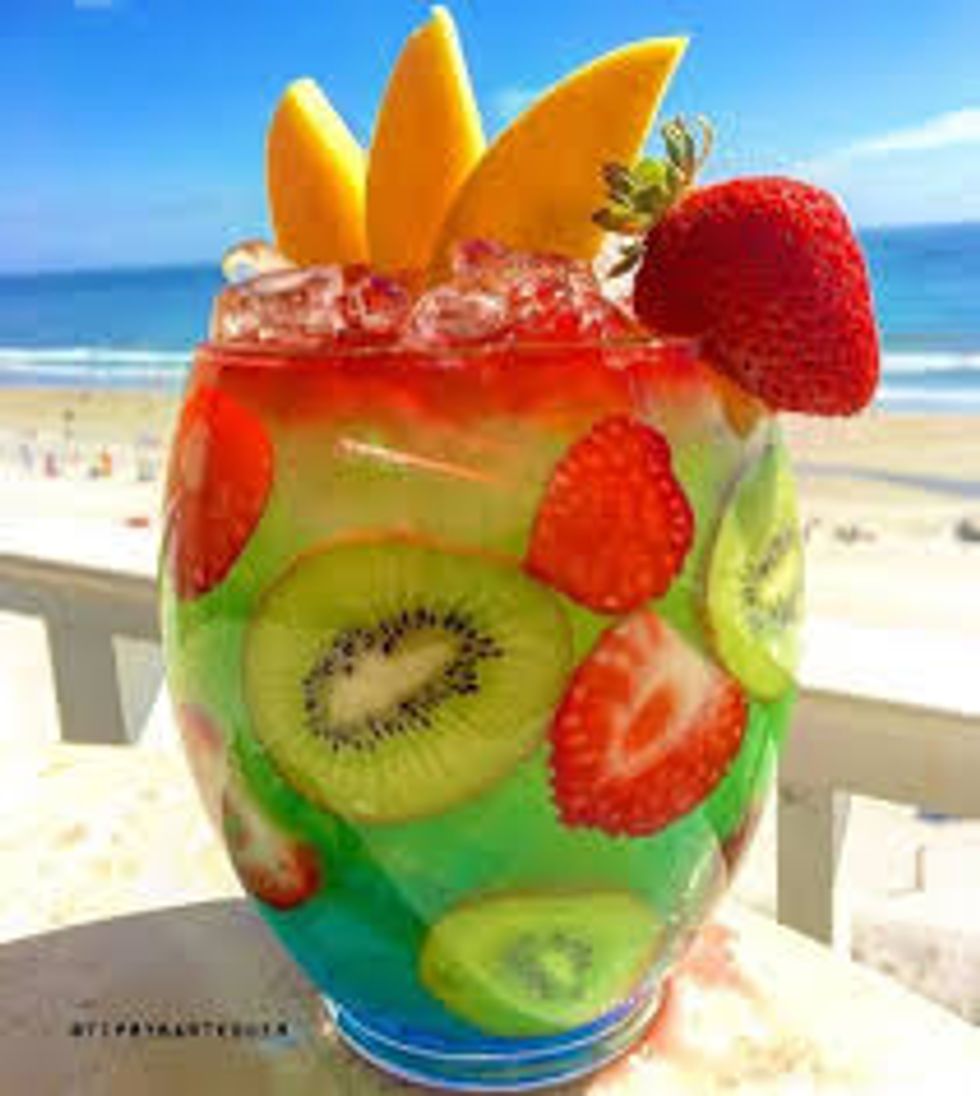 Sounds um… Interesting! 1 oz. of orange vodka, 1 oz. of peach schnapps, 6 oz. of pineapple juice, topped off with blue vodka and strawberries!