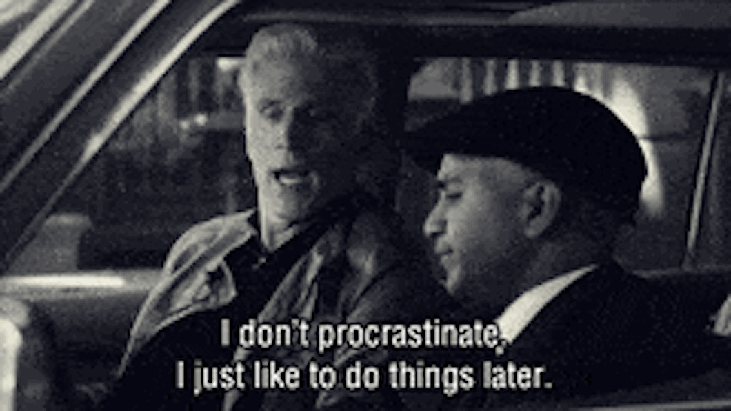 Which either consists of going to sleep or continuing that show that you're binge-watching that got you in the rut of procrastination in the first place. Procrastination is usually tied to the deadlines associated with it, knowing that deadlines are never your friend, but waiting last minute to get the work done either way.