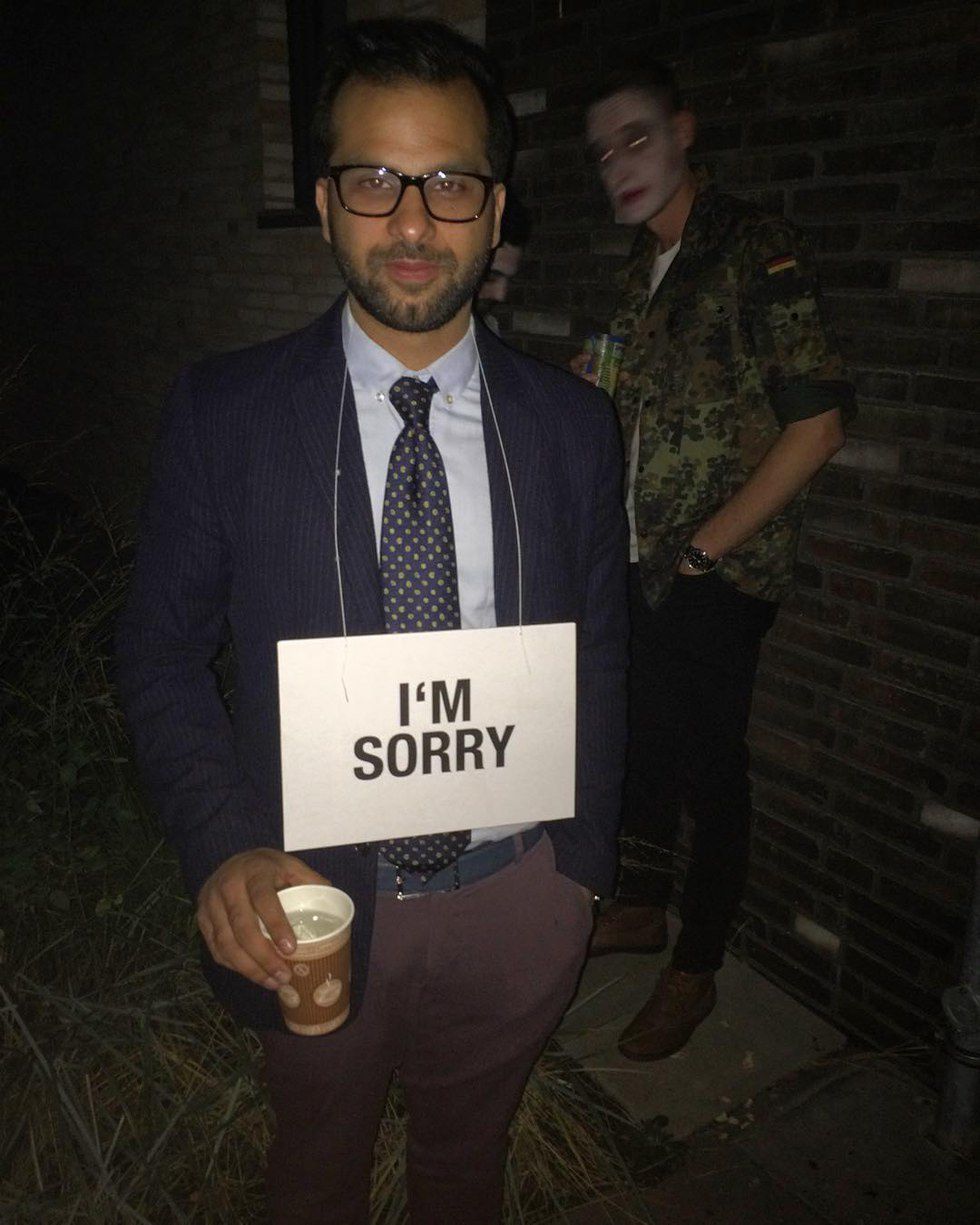How to pull it off: Slip on a fancy dress or suit, write "I'm sorry" on some card stock and string that bad boy around your neck. The perfect "I just came from work and don't feel like going to this party" costume.