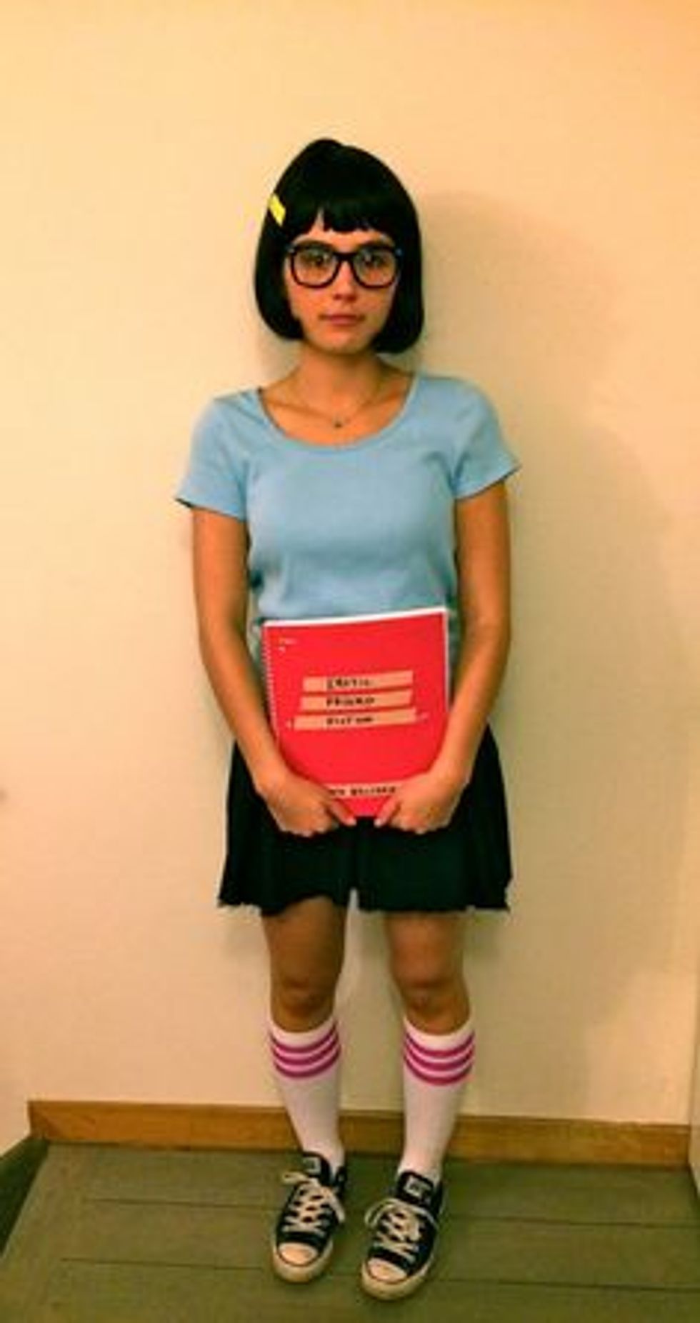 what you need: Light blue shirt, dark blue skirt, black sneakers, white crew socks, glasses, a love for butts (p.s. this is another one you can turn into a group costume, be the whole Belcher Clan!!)