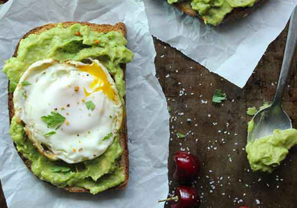 Avocados contain monounsaturated fat, which will help stabilize your blood sugar and keep you full throughout the morning. Try ditching the butter or cream cheese and try this instead!
