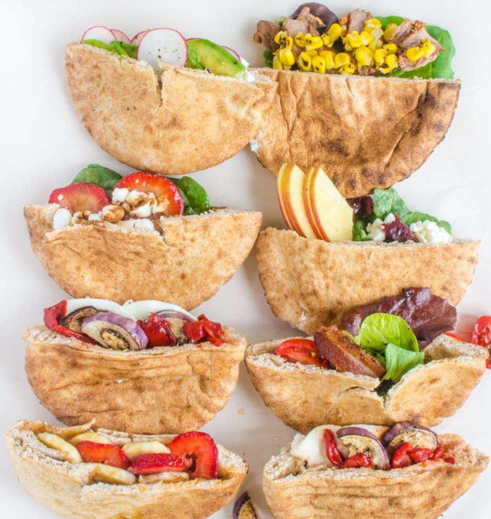 There are a variety of sandwiches you can try, but my favorite foods to pair with pita bread are hummus and veggies.