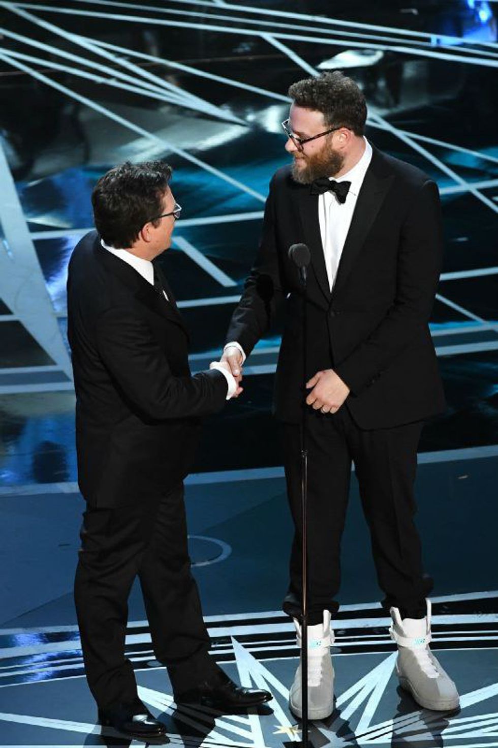 Rogen payed tribute to Back to the Future, a movie that inspired him in a lot of ways, and took the stage with Back to the Future star Michael J. Fox. They entered in a DeLorean (with Rogen in "future shoes") and, to top it all of, gave a hilarious rendition of "The Schuyler Sisters" from Hamilton.