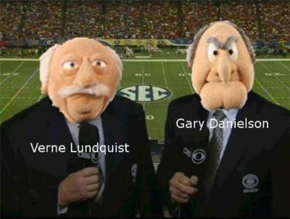Over the years, there has been much groaning by fans over the announcers of the CBS afternoon broadcast. Uncle Verne and Gary can never seem to get much right and ramble on like many announcers do. Part of me wants them to hang it up, but they do kind of grow on you like that idiot friend you may have. For those of you who don't know what I am talking about, the pair can be compared to Waldorf and Statler from the Muppets (they sort of look like them too).