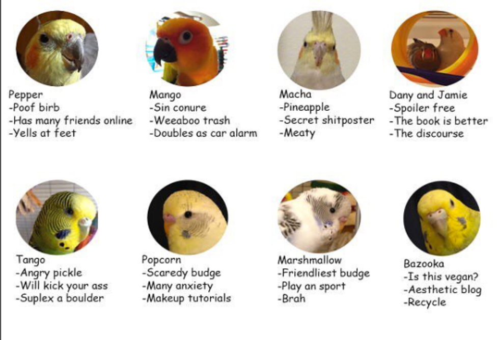 16. Pepper and Pals: This is one of the bonus account I'm adding to the list! Pepper and Pals is for all you memers out there. I myself love some quality memes and let me tell you: Pepper and Pals does not disappoint in the bird meme department. Just yesterday, my brother shared 3 of their memes on Facebook. Besides the meme content, Pepper the cockatiel and his bird family that consists of another cockatiel named Macha, four budgies named Tango, Marshmallow, Popcorn, and Bazooka, a sun conure named Mango, and two finches named Dany and Jamie.