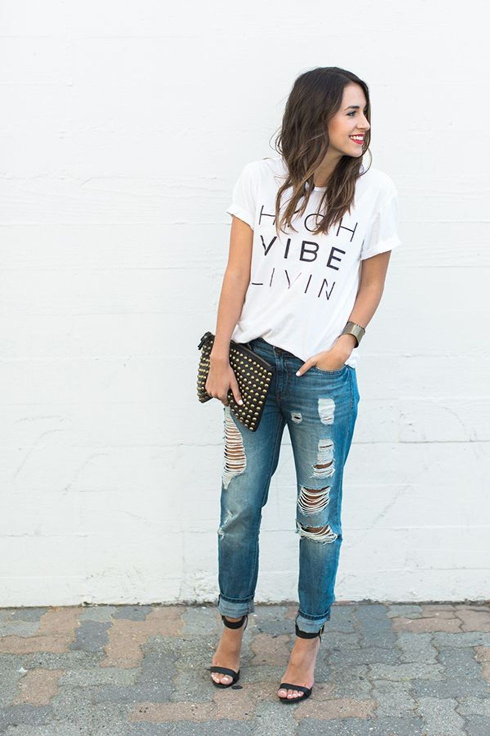You can't go wrong with jeans and a t-shirt. Having a go-to t-shirt and pairing it with jeans a simple outfit to throw together quickly. Add or subtract any layering pieces to make it different each time you rock it.