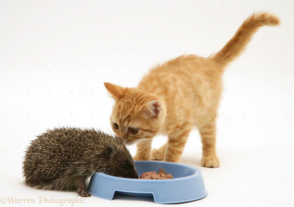 My orange cat is my best friend and all I want in my life is a pet hedgie, so this is just the best picture I could have stumbled upon. Look at her steal the kitten's food. So cute.