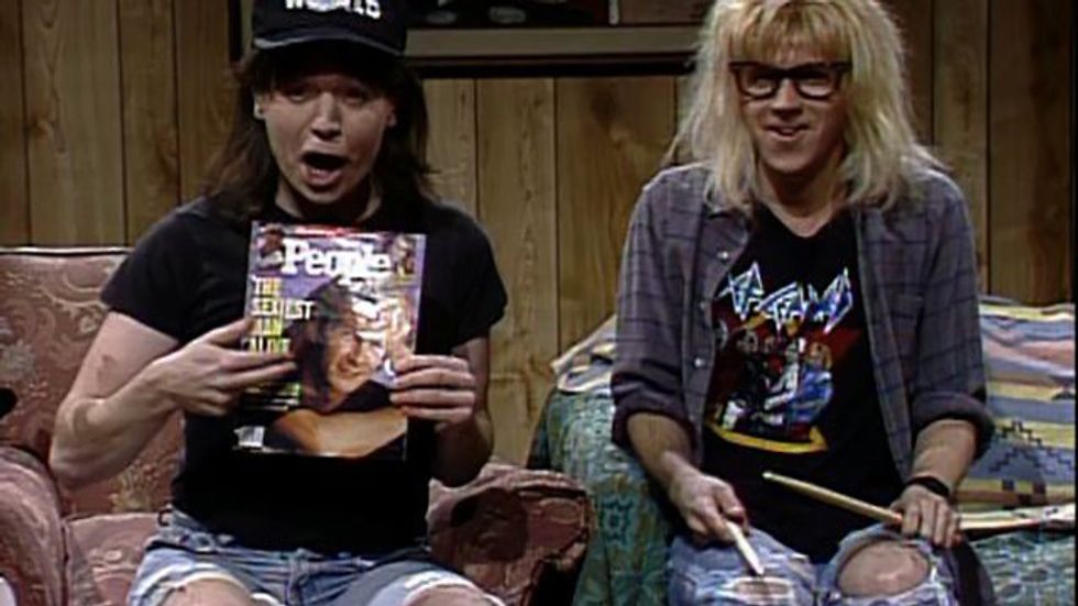 Mike Meyers and Dana Carvey are Wayne Campbell and Garth. "It's Friday, it's 10:30, it's time to party, I'm your excellent host Wayne Campbell, with me as always is Garth. ' Party on Wayne' 'Party on Garth'." You know it's time to party when "Wayne's World" comes on. Here is the sketch when Aerosmith came to visit "Wayne's World."