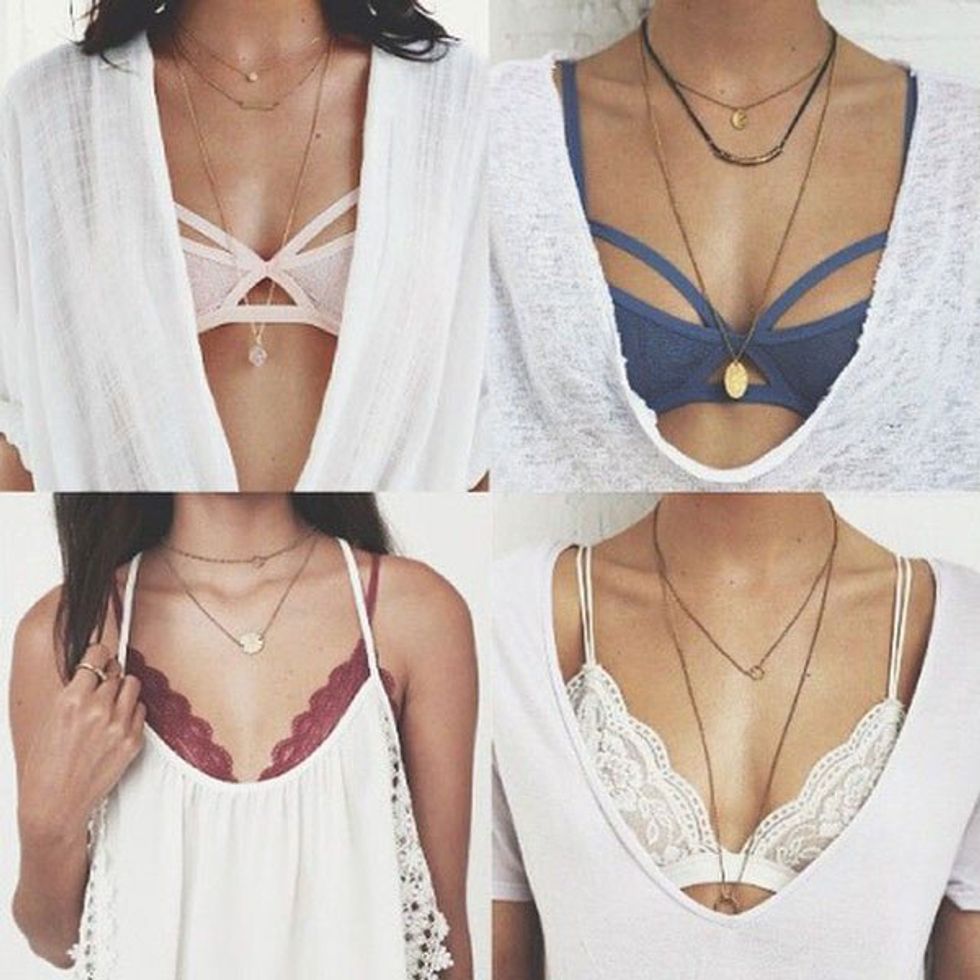 Bralettes are huge right now, and a recent way they have been being styled is underneath sweaters to give them a funky, cool, and comfortable look.