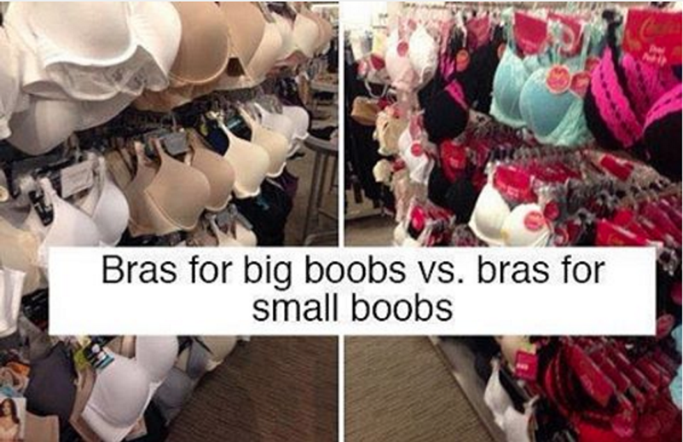 I think if I went into ten different stores, each place would give me a different bra size. But let's face it, larger bras usually stick to nudes, blacks and whites. The smaller ones are all colorful and lacy. All those bandeaus and bralettes that are super cute don't work out for us. I literally had to go to a store one time that was intended for women 60 or older just to find a bra that fit me comfortably. The most "risqué" bra was a pastel pink with lace trimming and no padding.