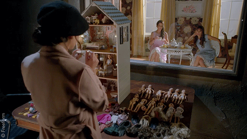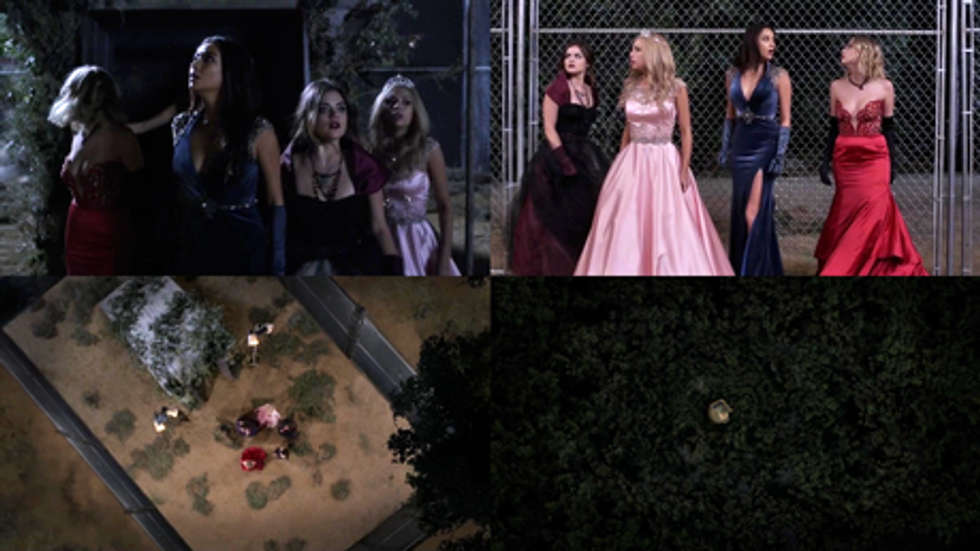 Hanna, Emily, Aria, Spencer, and Mona (dressed as Alison) in the Dollhouse, Charlotte’s underground bunker.