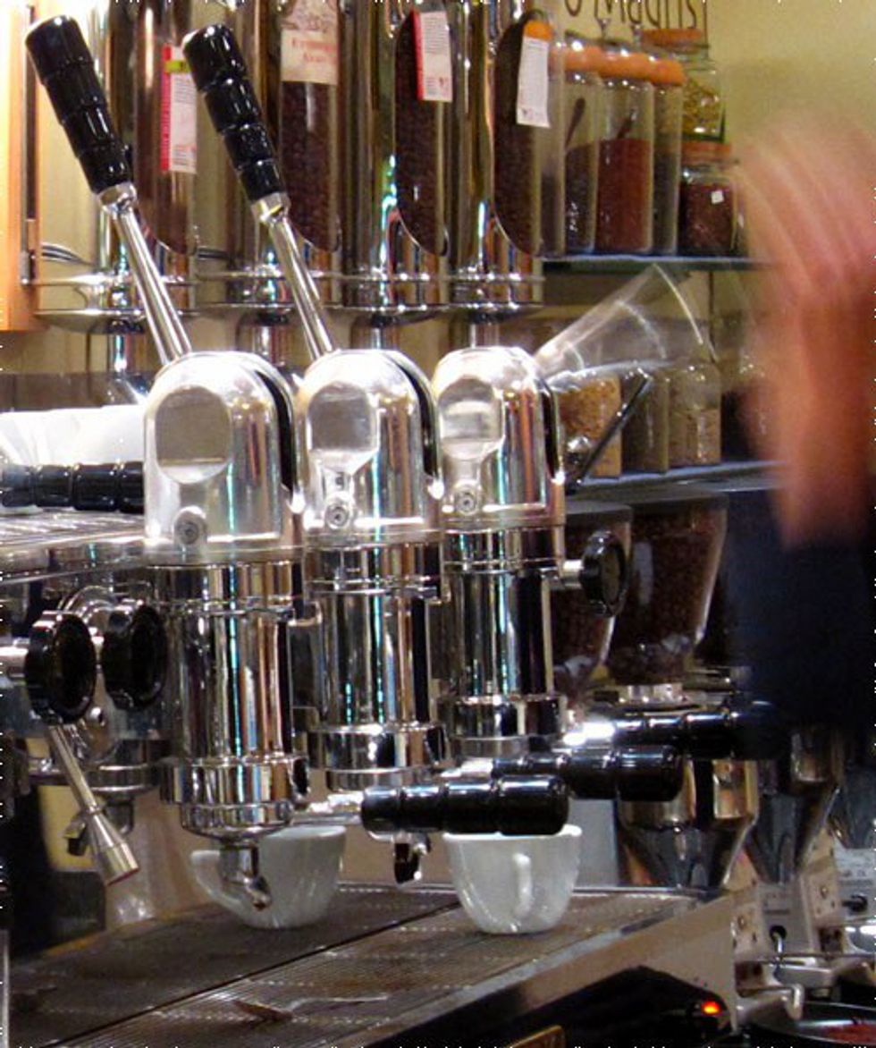 Travis at Insight Coffee's capitol location in Sacramento showed me how to pull a shot of espresso using a lever machine. Fine grounds have to be pressed evenly to allow for even extraction. Once the bottom is about 60-70 percent bubbled over, pull the lever. The first part of the shot will be under extracted; some at the top will be over extracted (crema). Some over extraction is good, but not too much.