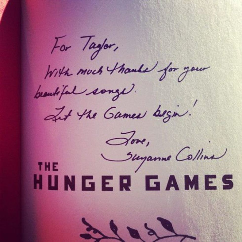 14. Suzanne Collins, author of "The Hunger Games," sent Taylor a personally inscribed copy of her book in thanks for writing the songs "Safe and Sound" and "Eyes Open" for the movie version.
