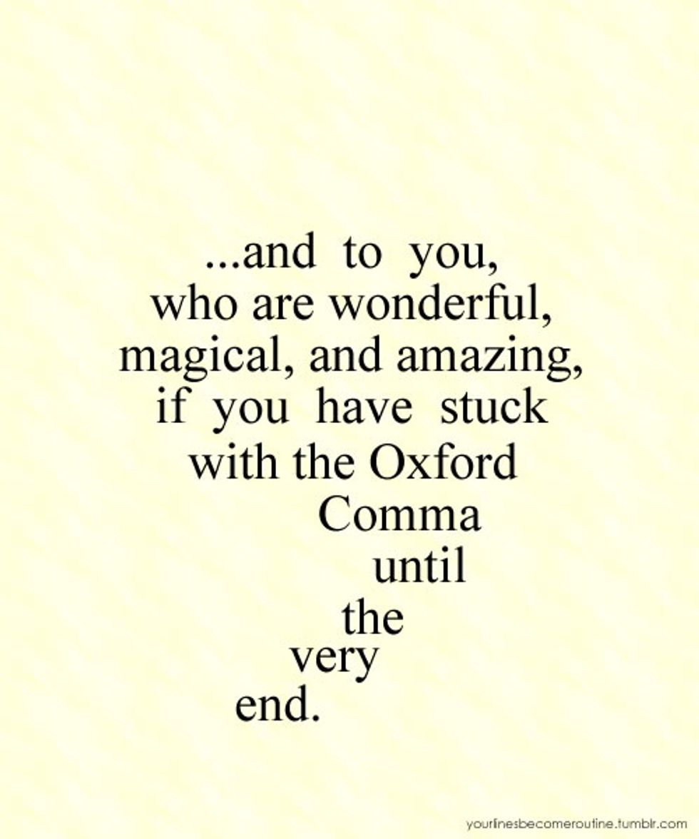 Keyword: optional. If you were wondering, I'm pro-comma. It's actually one of the most important pieces of punctuation out there in my opinion. But people with my opinion are losing the battle, and it's heartbreaking. The Associated Press and New York Times style guides have already done away with it. Even at The Odyssey (which follows AP Style), the Oxford Comma gets edited out of my articles, and I die a little bit on the inside whenever that happens. It may even ironically be edited out of this article, too. My apologizes if that happens; I swear I'm not a hypocrite. (Copyeditor's note: We retained Oxford commas in this article.)