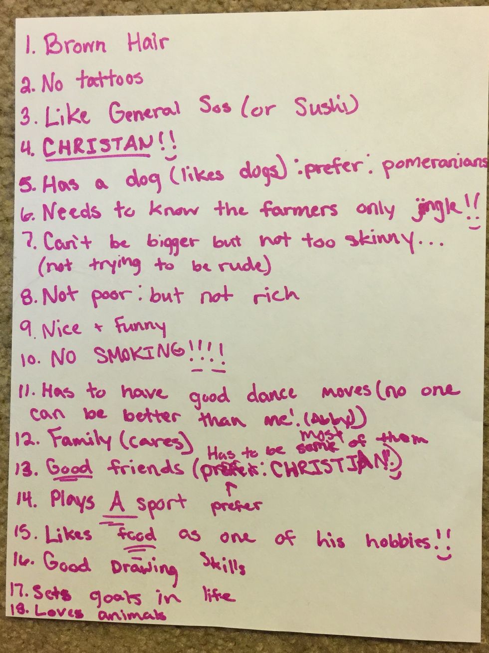 Based off an "18 Requirements to Date my Sister" created by my own little sister, age 12. (Shown below)