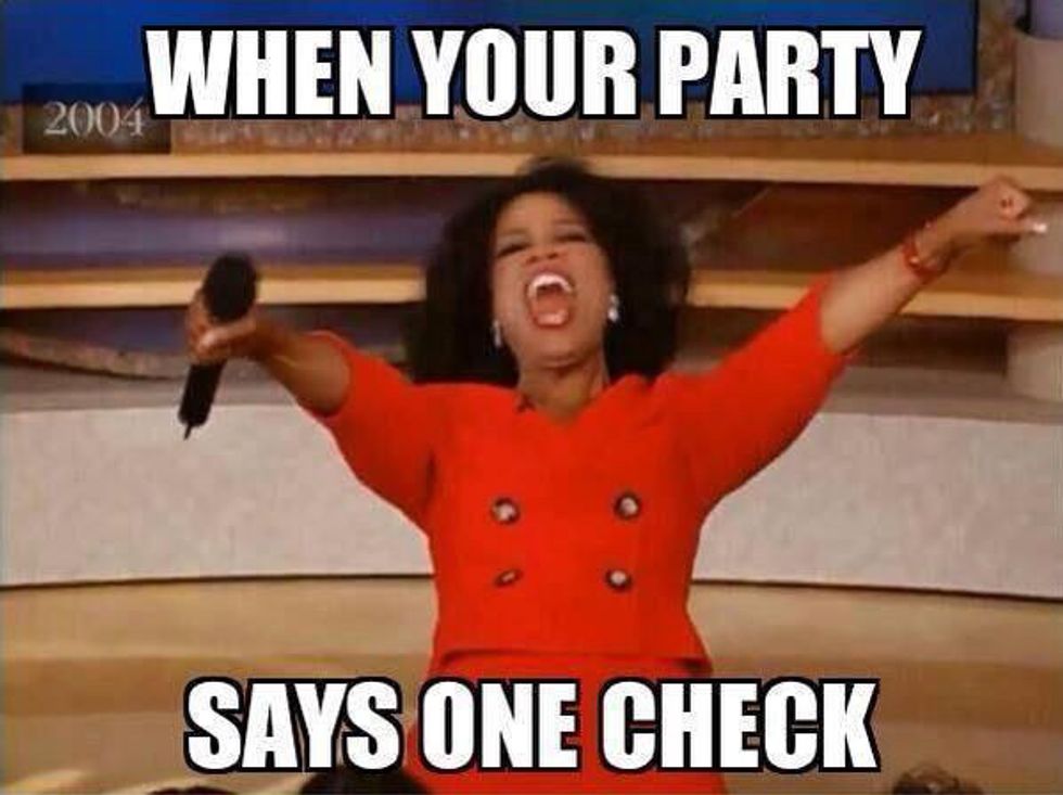 3. Sometimes you get lucky with one check and sometimes you have to split a check 25 ways and hog the server screen for an hour.