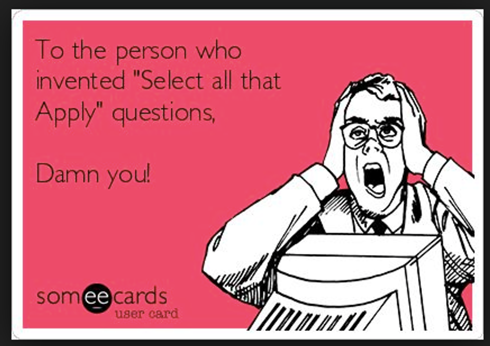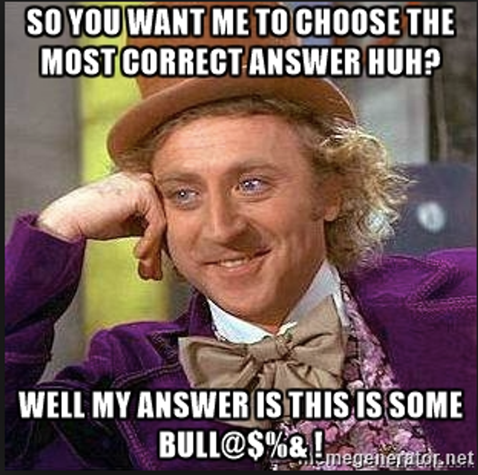 This "select all that apply" is 10x worse than choosing the answer that is most correct. It doesn't matter if you have 2 of the 3 answers that are correct, you still get the entire question wrong. Not to mention, almost every single question on our licensing exam is select all that apply. If you think these are easy, you are simply not human.