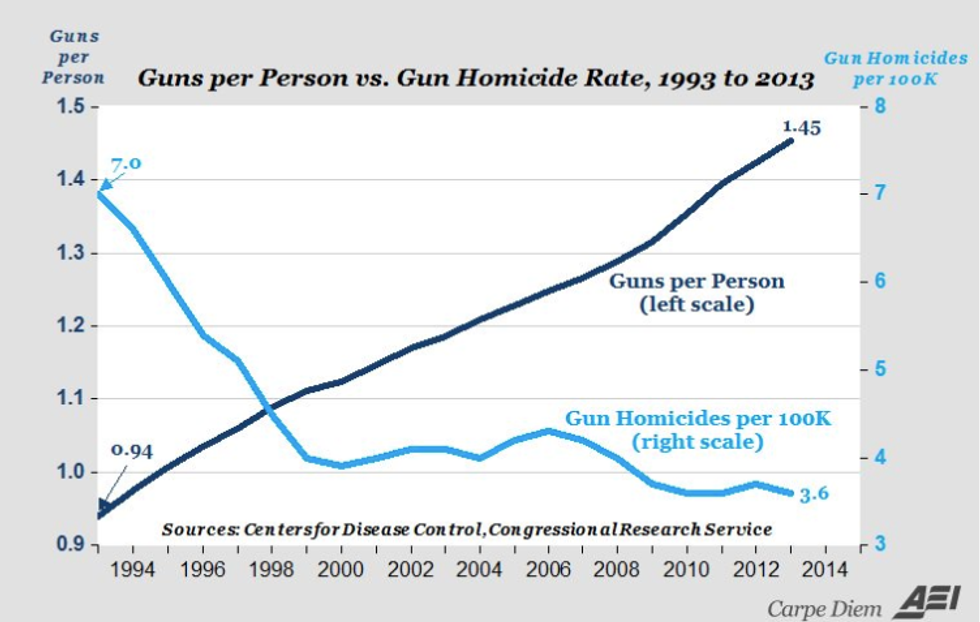The number of guns has increased in the United States while gun homicide is decreasing overall.