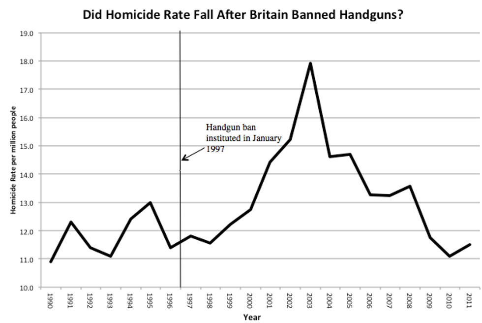 After a school shooting in the U.K., they instituted tougher gun laws. The result? Firearm-specific and general homicide rates went up.