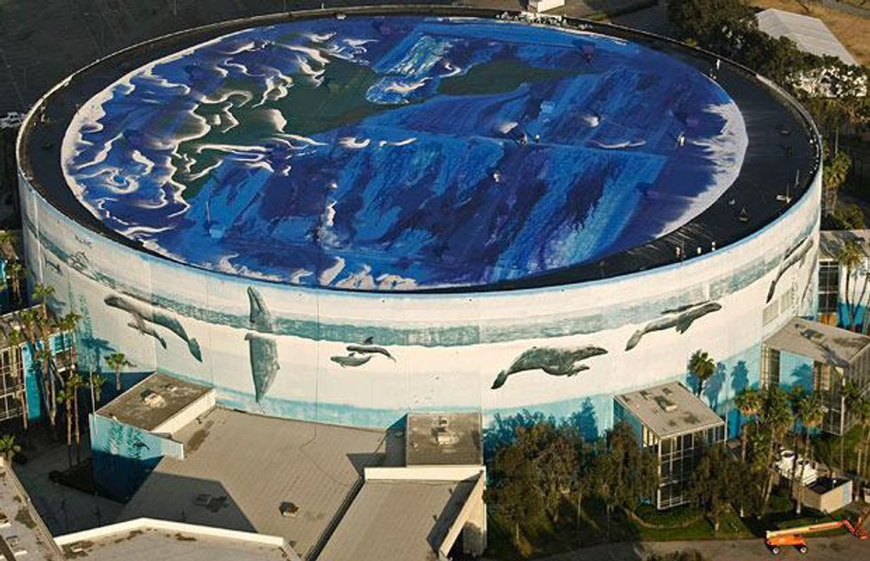 Environmental marine artist Wyland broke the Guinness Book of World Records twice on the Long Beach Arena, first in 1993 and again in 2009. “Earth, the Blue Planet,” covers the rooftop of the arena totaling a span of three acres.