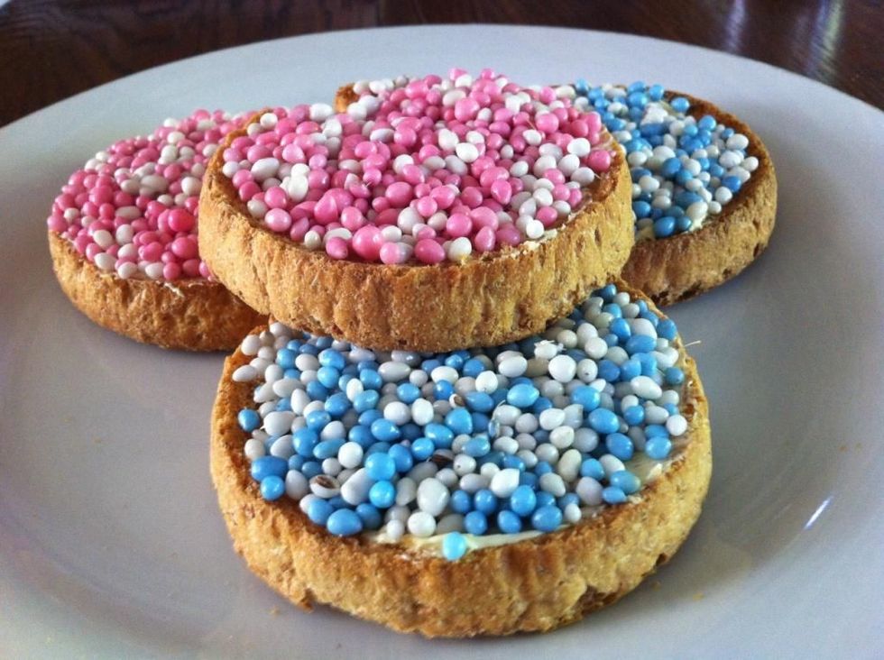 When a child is born the Dutch celebrate with 'beschuit met muisjes'. Pink for a girl, blue for a boy. (I really don't like the 'muisjes' tho, because they're made of anise and that's just really gross to me).