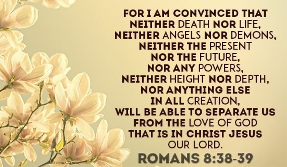 "For I am convinced that neither death nor life, neither angels nor demons, neither the present nor the future, nor any powers, neither height nor depth, nor anything else in all creation, will be able to separate us from the love of God that is in Christ Jesus our Lord."
