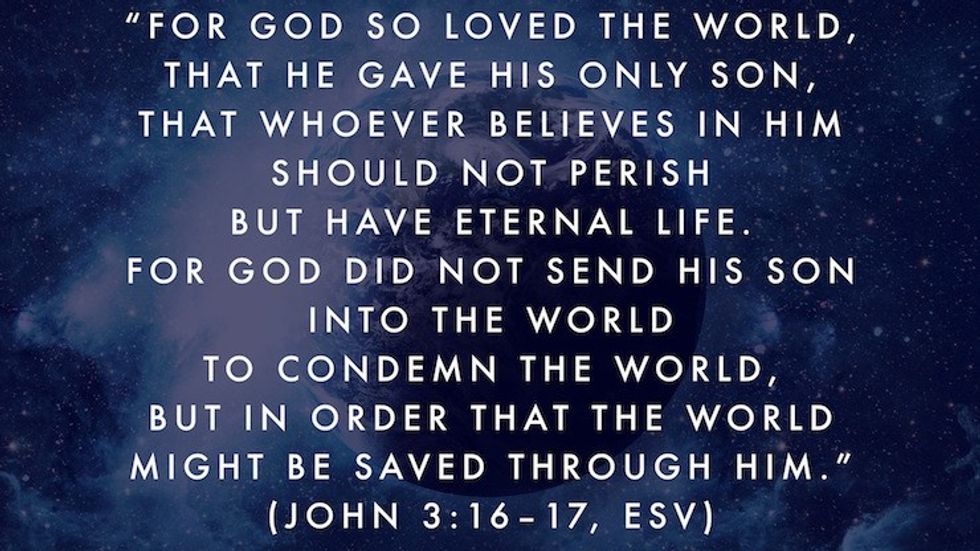 "For God so loved the world that He gave His one and only Son, that whoever believes in Him shall not perish but have eternal life. For God did not send His Son into the world to condemn the world, but to save the world through Him."