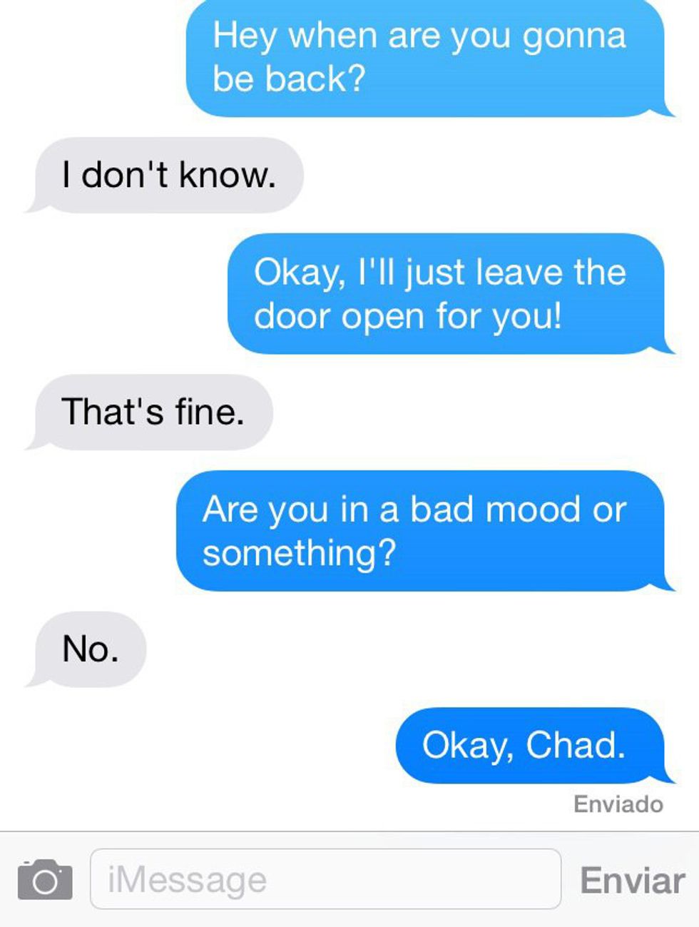 There is a time and place to be formal. Texting me about your life is not that time. Are you mad? Are you depressed? How the hell am I supposed to know.
