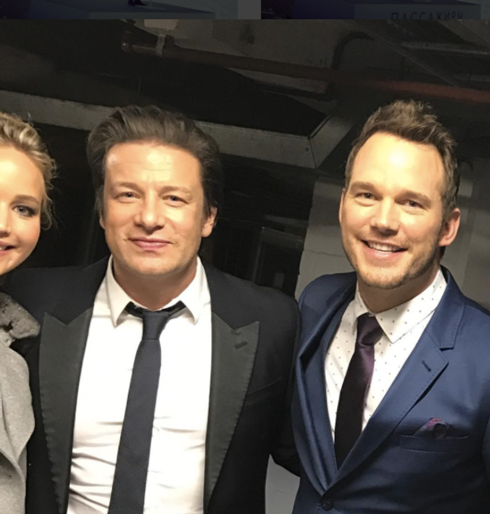 Me, #JenniferLawrence and @jamieoliver backstage at @thegrahamnortonshow promoting a film called #Passengers coming soon to a theatre near you. Can't believe I got to meet the naked chef!!! He was wearing clothes, but still!!!