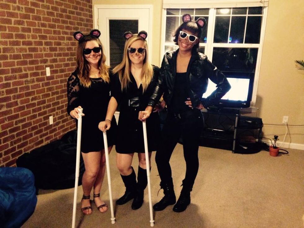 This costume is SHOCKINGLY easy. Use this when you can't decide who is included in your couples' costume. Wear all black with rounded ears, sunglasses, and walking sticks! Then, just paint whiskers, and you're good to go. For walking sticks, we used tension rods from Walmart!