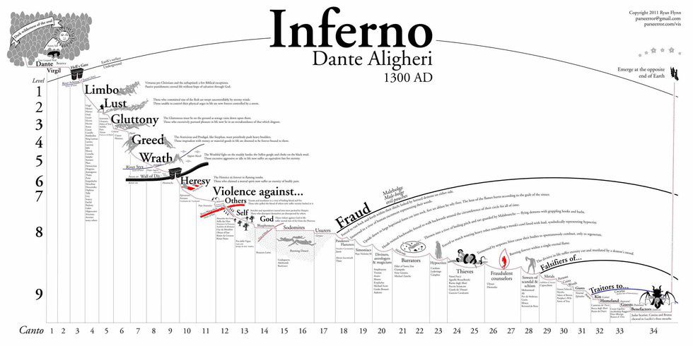 This is something straight out of your high school English Literature course, and quite frankly would have been helpful then to pass the class. It gives a very detailed portrayal of each circle, and the corresponding punishments, as well as some famous people found in the circles.