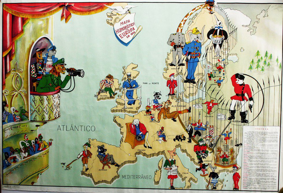Now for some real world maps. This one is a satirical look at Europe during the Cold War, as seen in a Portuguese magazine. It gives a rather comedic view from a western nation during the time of the Eastern Bloc.