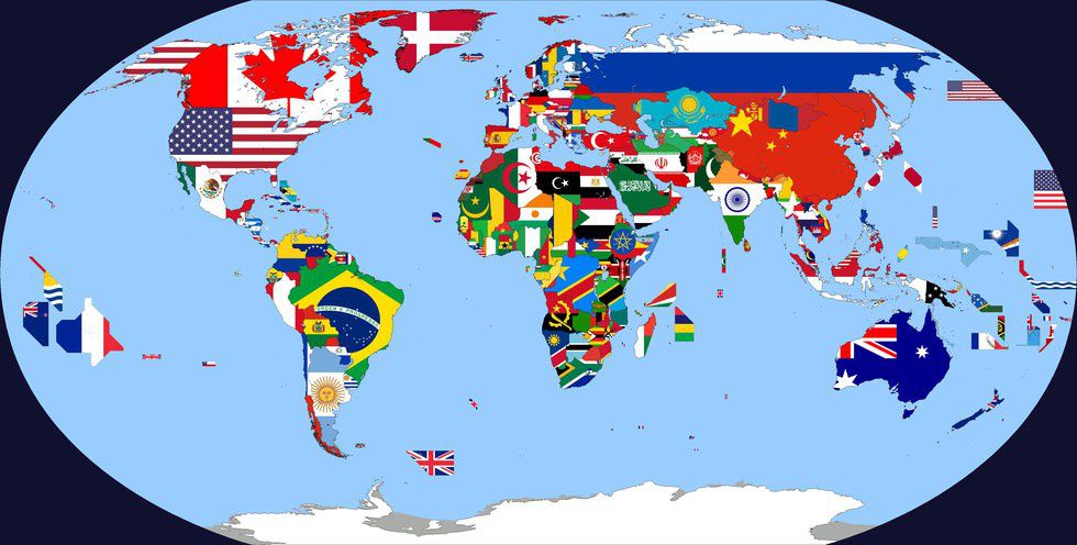 One of my favourite type of maps, this map overlays the flags of every country in the world upon their corresponding territory. Yes, I realise that there are huge chunks of land in the Pacific, those denote the Equatorial borders of islands. It's also interesting to see colour and stylistic patterns by region, especially around Europe and Africa.